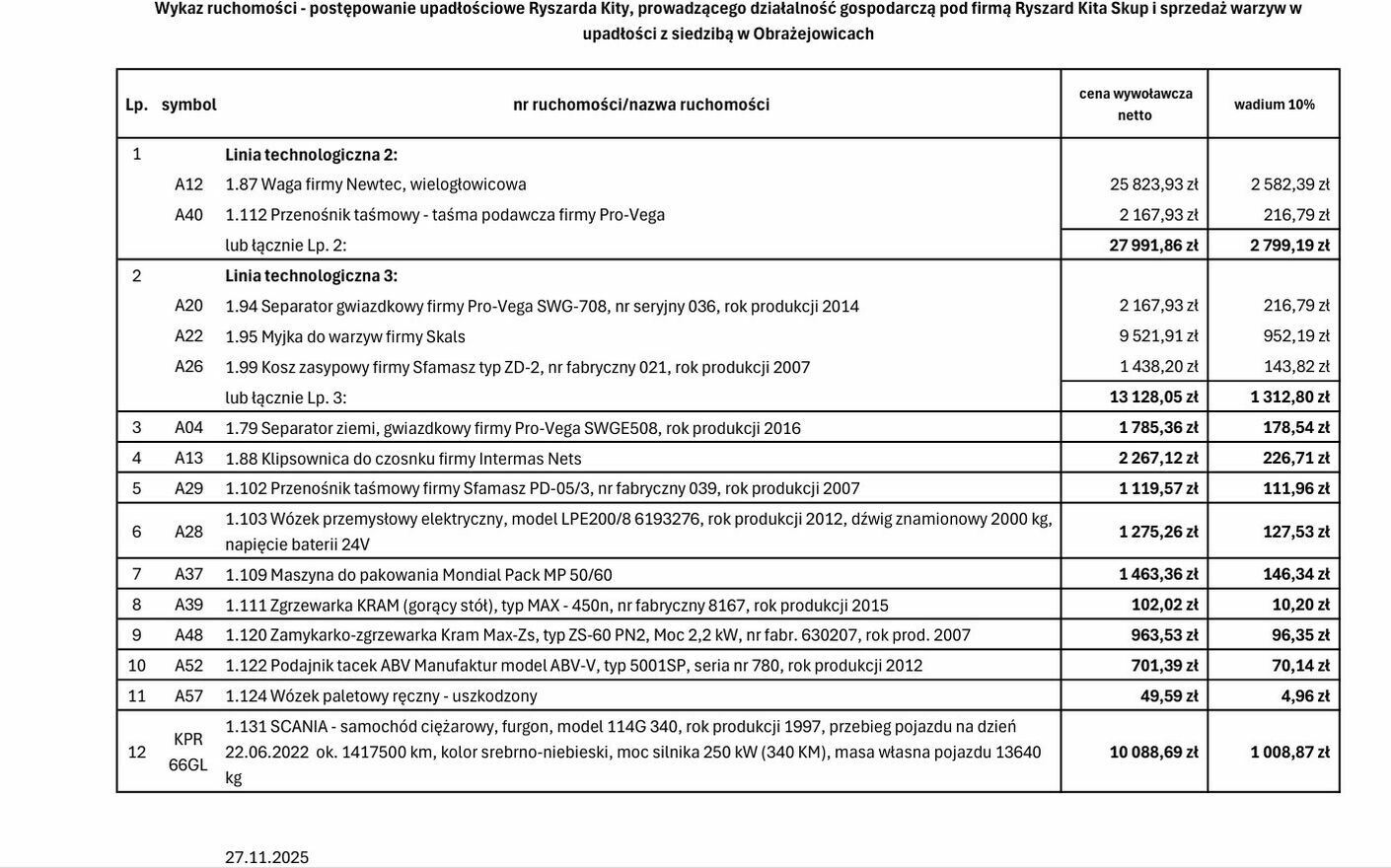 wadium w wysokości 10% ceny wywoławczej za Ruchomość (w załączonym wykazie wskazano wysokość wadium poszczególnych Ruchomości), najpóźniej do dnia 24 lutego 2026 r. Za datę wpływu uważa się dzień uznania kwoty na rachunku bankowym upadłego. Wpłacone wadium zostanie zaliczone na poczet ceny nabycia ruchomości.
